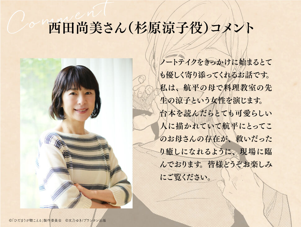 | 中沢元紀&小林虎之介W主演『ひだまりが聴こえる』メインビジュアル公開 追加キャストに西田尚美、でんでんら …ていく姿を繊細に描いた文乃ゆき氏による原作『ひだまりが聴こえる』、そして続編にあたる「ひだまりが聴こえる-幸福論-」の2作をもとに実写化。 難聴によ… (出典:オリコン) |