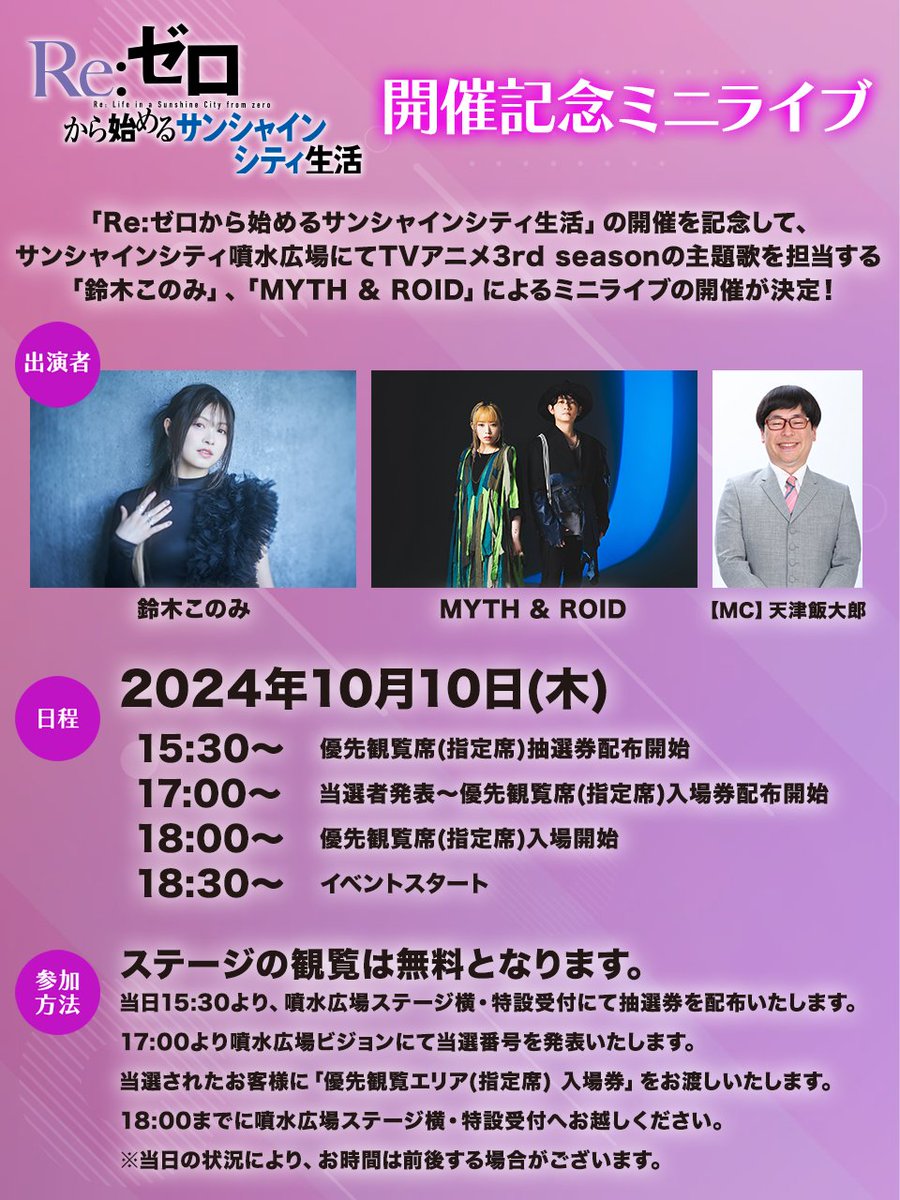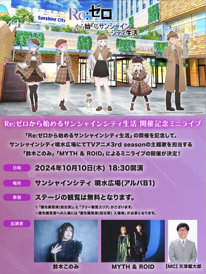 @Rezero_official◪イベント情報解禁◪ 「Re:ゼロから始める異世界生活」 サンシャインシティ生活開催📰✨ 10月10日(木)~より実施! ここでしかゲットできないグッズはもちろん、 イベント初日には噴水広場にて 主題歌アーティストによるライブまで🎤 ▼詳しくはこちら event-info.kadokawa.co.jp/rezero-sunshin… #リゼロ #rezero pic.x.com/8ag2jwdddc