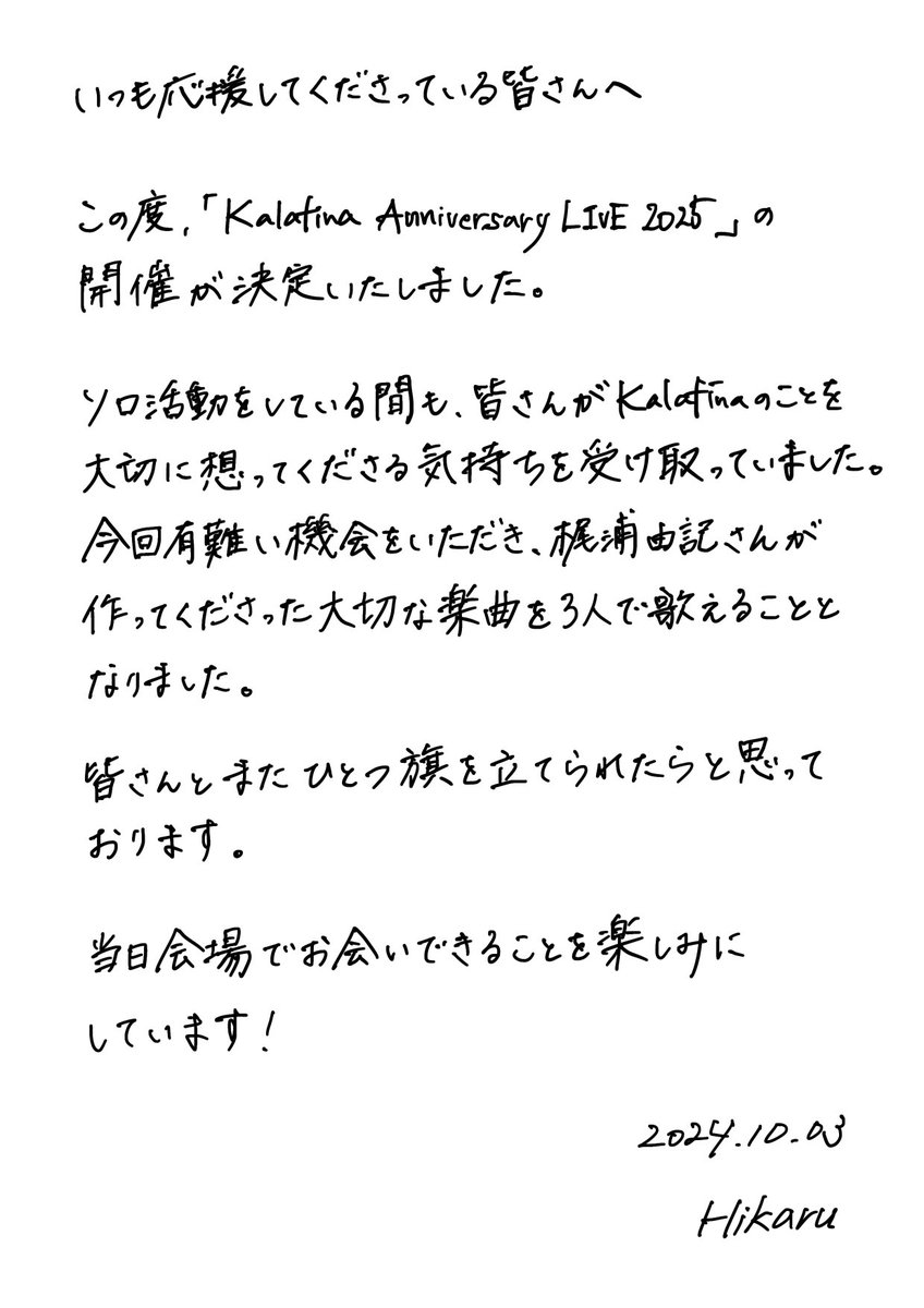 | Hikaru「作ってくださった大切なKalafina楽曲を3人で歌える」復活へ個人的な思い 2019年(平31)3月に解散した3人組ボーカルユニットKalafinaが3日、復活を正式に発表した。 メンバーのHikaru(37)が同日、イ… (出典:日刊スポーツ) |